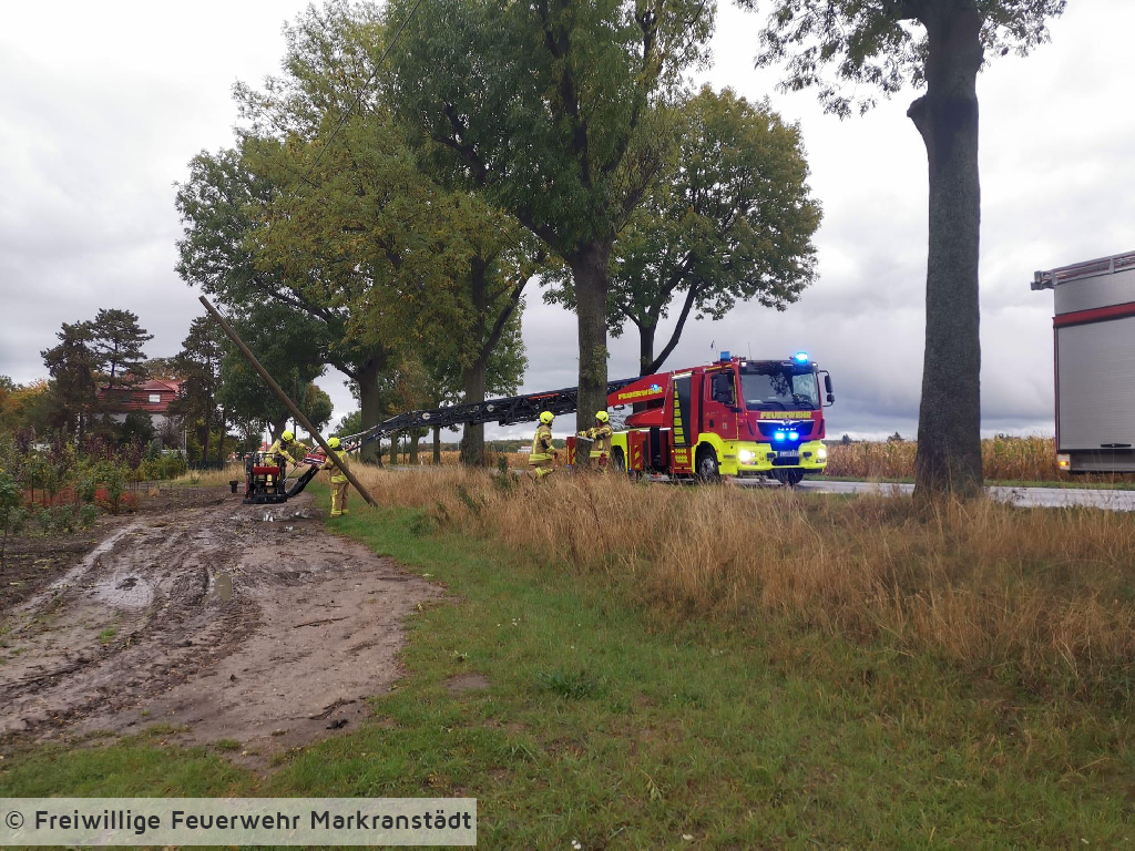 Am späten Samstagnachmittag wurde die Feuerwehr zu Sicherungsarbeiten alarmiert. Gegen 17:12 Uhr ging die Meldung ein, dass ein Telefonmast auf ein angrenzendes Feld zu kippen drohe. Nach erster Erkundung konnte kein Strommast festgestellt werden, woraufhin die Einsatzkräfte den betroffenen Bereich kontrollierten. Vor Ort bestätigte sich die Lage. Ein Telefonmast war stark geneigt und drohte umzustürzen. Zur Gefahrenbeseitigung wurde der zuständige Telefonnetzbetreiber informiert. Nach Rücksprache mit diesem und zur Sicherstellung der Verkehrssicherheit wurde der Mast kontrolliert zu Boden gebracht.