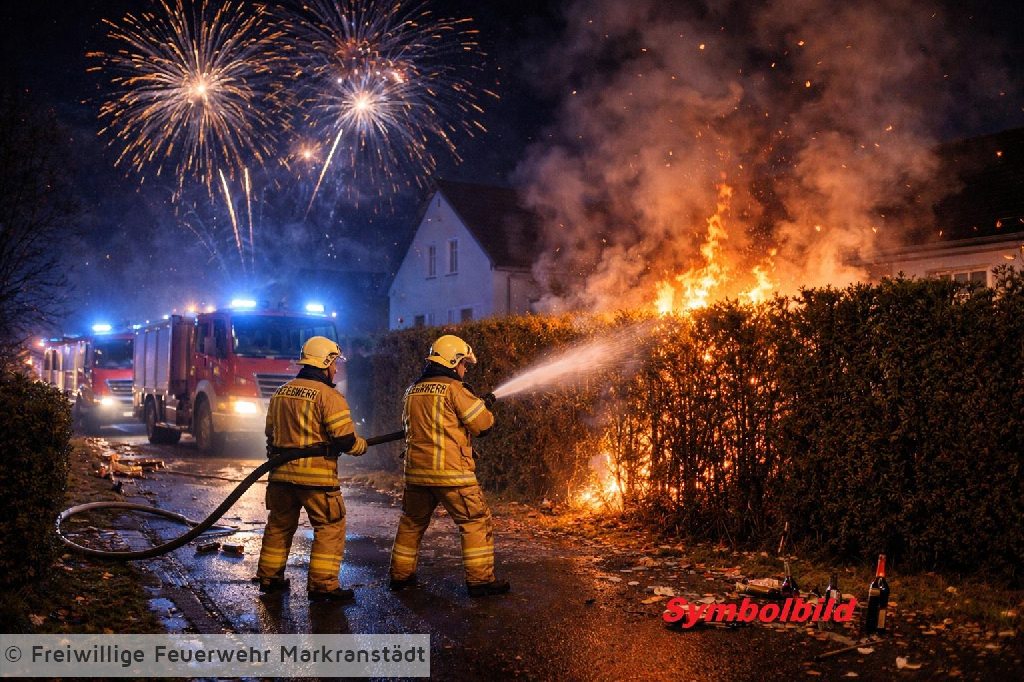 In den frühen Morgenstunden des Neujahrstages wurde die Feuerwehr Markranstädt zu einem Brandereignis in der Nähe eines Gebäudes alarmiert. Gegen 02:50 Uhr meldeten Anwohner eine brennende Hecke am Gebäude. Beim Eintreffen der Einsatzkräfte stellte sich heraus, dass die betroffenen Bewohner den Brand bereits eigenständig weitgehend abgelöscht hatten. Die Feuerwehr führte daraufhin Nachlöscharbeiten durch, um ein erneutes Aufflammen zu verhindern und die Brandstelle vollständig zu sichern. Aufgrund der Lage waren neben der Feuerwehr auch Polizei und Rettungsdienst an der Einsatzstelle eingebunden. Um 03:15 Uhr konnte die Abschlusslage gemeldet werden. Das Feuer war vollständig gelöscht, die Einsatzstelle wurde an die Polizei übergeben. Anschließend rückten die Einsatzkräfte der Feuerwehr wieder in den Standort ein.