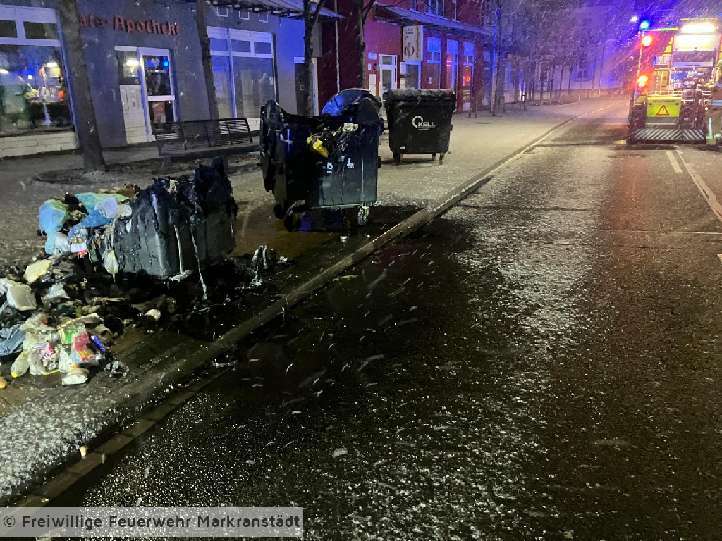In den frühen Morgenstunden des 16.02.2026 wurde die Feuerwehr zu einem Brandereignis im Stadtgebiet Markranstädt alarmiert. Gegen 03:38 Uhr standen zwei Müllcontainer in Vollbrand. Die Feuerwehr leitete umgehend Löschmaßnahmen ein und konnte das Feuer nach kurzer Zeit unter Kontrolle bringen. Ein Übergreifen der Flammen auf umliegende Bereiche wurde verhindert. Gegen 03:50 Uhr war der Brand vollständig gelöscht. Die Einsatzstelle wurde anschließend zur weiteren Bearbeitung an die Polizei übergeben.