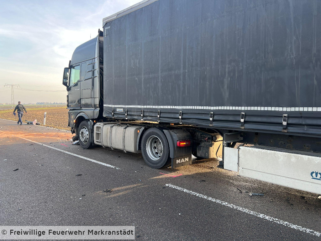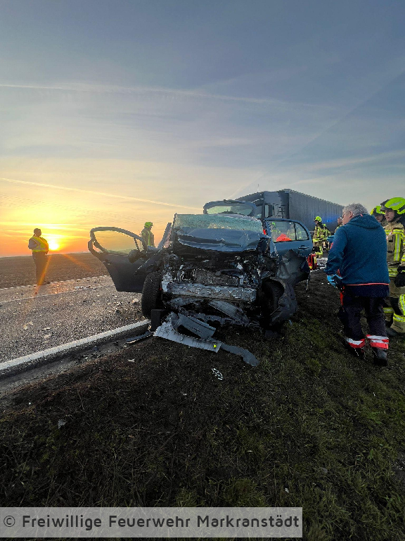 Am heutigen Tag wurde die Feuerwehr zu einem schweren Verkehrsunfall zwischen einem PKW und einem LKW alarmiert. Bereits auf der Anfahrt erhielten die Einsatzkräfte die Meldung, dass eine Person im PKW eingeklemmt sei. Beim Eintreffen an der Einsatzstelle bestätigte sich die Lage. Die eingeklemmte Person war nicht ansprechbar, sodass umgehend eine sogenannte Sofortrettung eingeleitet wurde. Parallel zur technischen Rettung aus dem Fahrzeug wurde die medizinische Erstversorgung vorbereitet. Die Feuerwehr befreite die Person schnellstmöglich aus dem PKW und begann unmittelbar mit der Versorgung des Patienten bis zum Eintreffen des Rettungsdienstes. Nach Übergabe an den Rettungsdienst unterstützten die Einsatzkräfte weiterhin bei der Reanimation. Trotz aller Bemühungen verstarb die betroffene Person noch an der Einsatzstelle. Neben der Menschenrettung wurden durch die Feuerwehr weitere Sicherungsmaßnahmen durchgeführt. Die Einsatzstelle wurde umfassend abgesichert, der Brandschutz sichergestellt sowie beide Fahrzeuge stromlos geschaltet. Auslaufende Betriebsstoffe wurden abgestreut und gebunden, um Umweltschäden zu vermeiden. Nach Abschluss der Maßnahmen wurde die Einsatzstelle an den Unfalldienst der Polizei übergeben. Die Feuerwehr konnte anschließend wieder in das Gerätehaus einrücken.