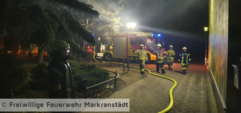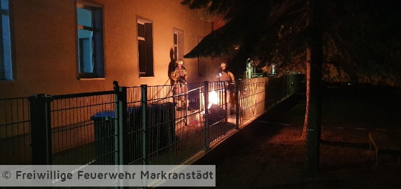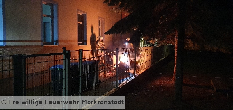 Die Kameradinnen und Kameraden fanden eine brennende Mülltonnen in einem Innenhof vor. Diese wurden mit einem C-Rohr gelöscht und die Einsatzstelle an die Polizei übergeben