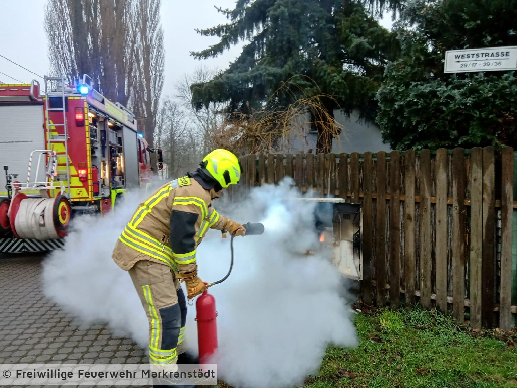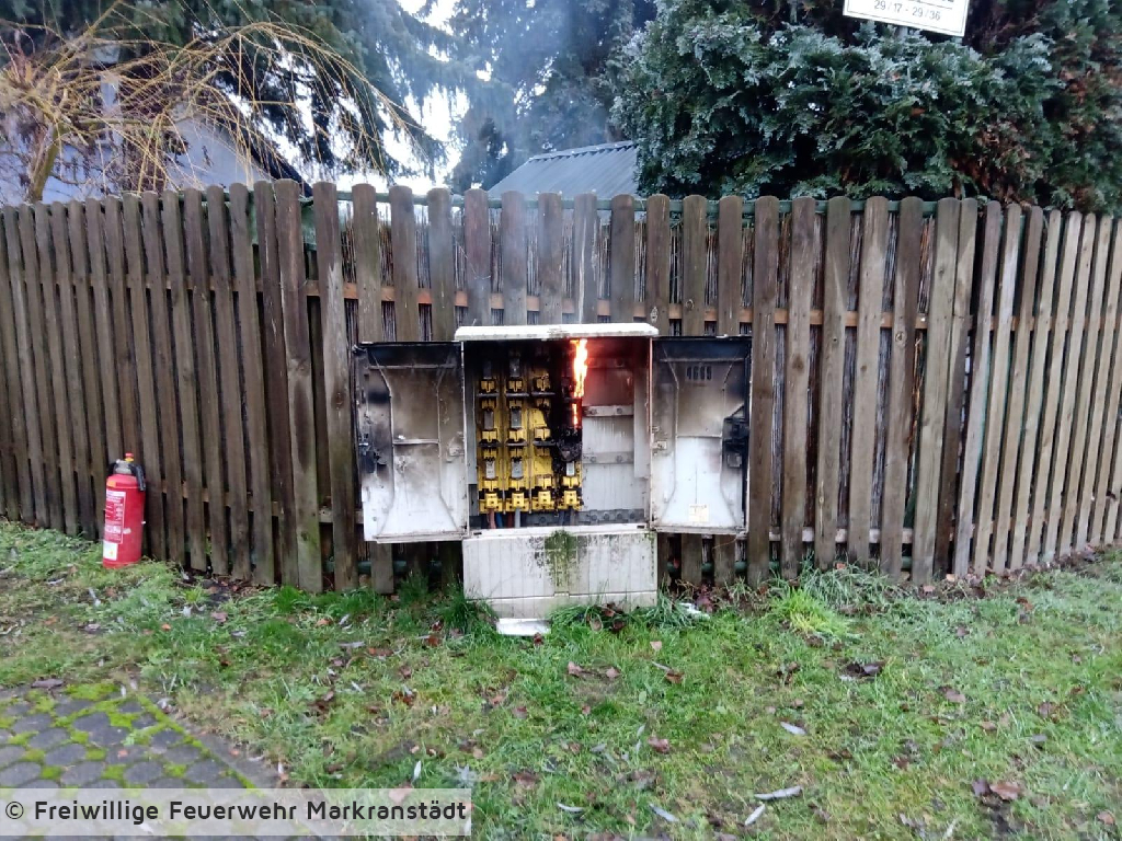 Beim Eintreffen an der Einsatzstelle fanden die Einsatzkräfte kein brennendes Kleinelektrogerät, sondern einen Stromverteilerkasten auf der Straße vor. Durch Zuhilfenahme eines Kleinlöschgerätes konnte der Brand zügig gelöscht werden. Nach erfolgreicher Brandbekämpfung wurde die Einsatzstelle an den Netztbetreiber übergeben.