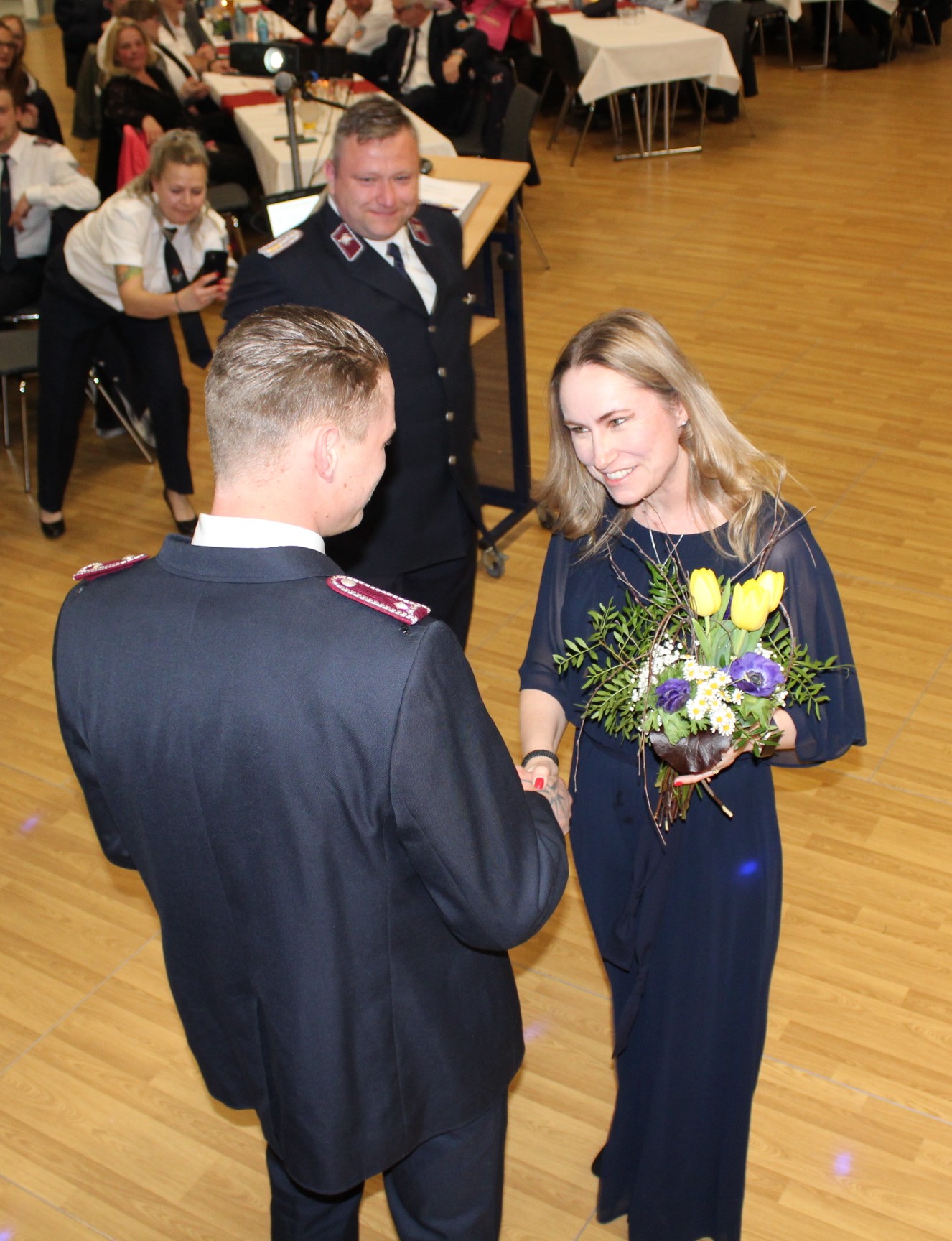 Im Namen der Kameradinnen und Kameraden bedankt sich Stadtwehrleiter, Sven Haetscher, bei Bürgermeisterin, Nadine Stitterich,  und ihrem Team für die abermals gelungene Ausgestaltung des diesjährigen Feuerwehrballs.