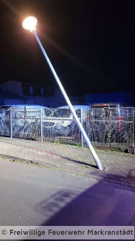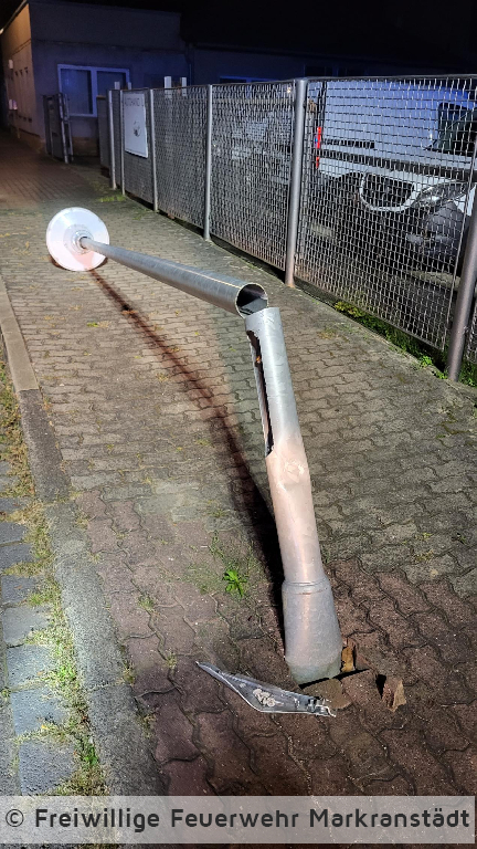 Beim Eintreffen an der Einsatzstelle bestätigte sich die Alarmmeldung. Beim Ausparken wurde eine Straßenlaterne beschädigt. Die Einsatzkräfte sicherten den Bereich und informierten den Netzbetreiber. Im Anschluss konnte die Laterne zu Boden gebracht werden und die Kameradinnen und Kameraden fuhren ihr Gerätehaus wieder an.