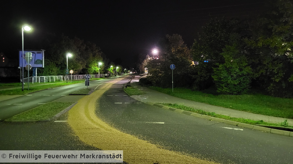Die eintreffenden Einsatzkräfte fanden eine größere Menge Erbsen am Kreisverkehr vor. Die Kameradinnen und Kameraden sicherten die Einsatzstelle bis zum Eintreffen der Polizei. Nachdem die Polizei den Verusacher ermittelt hatte, kam dieser zur Einsatzstelle und beräumte seine Erbsen. Somit bestand kein weiterer Handlungsbedarf mehr für die Feuerwehr.