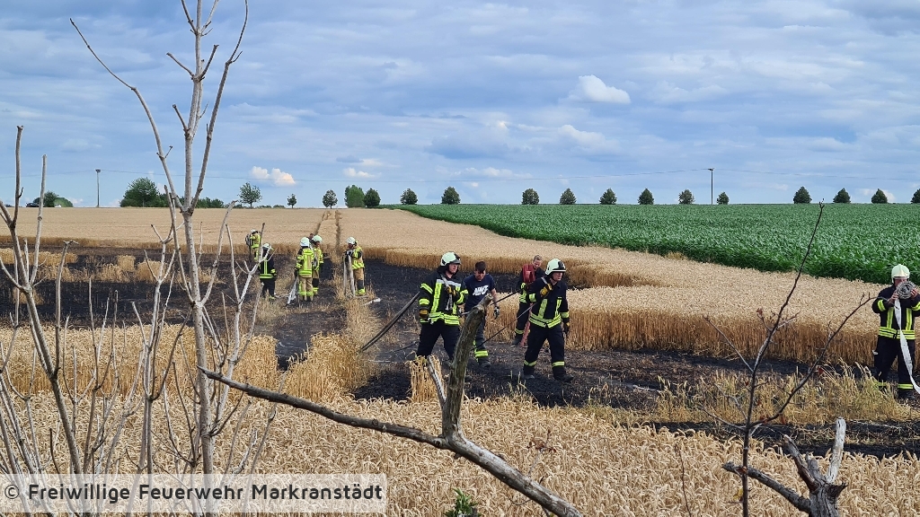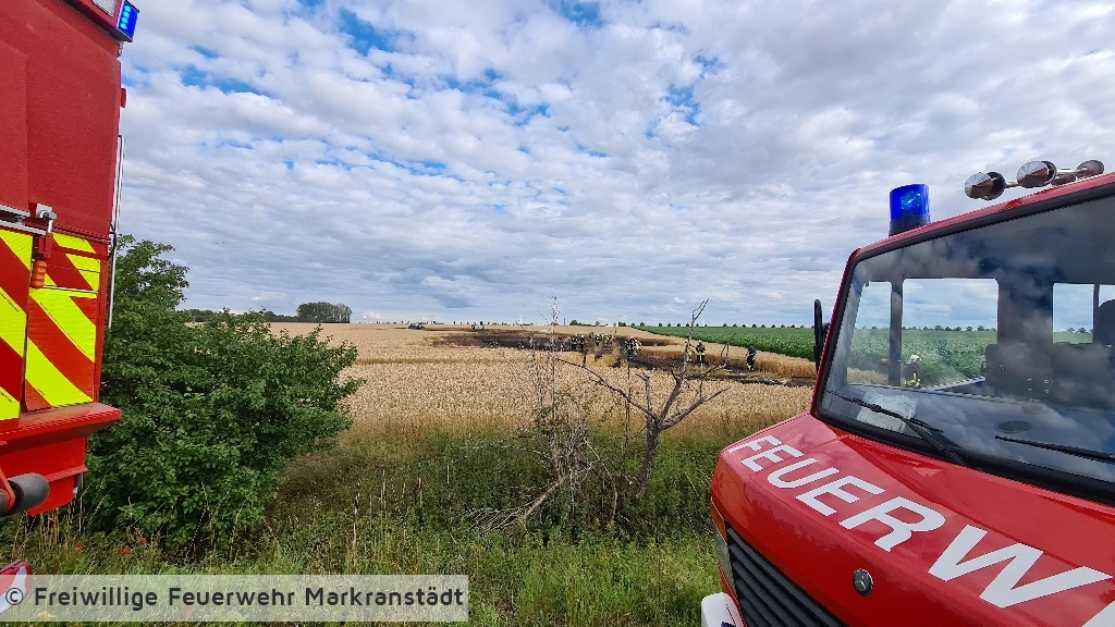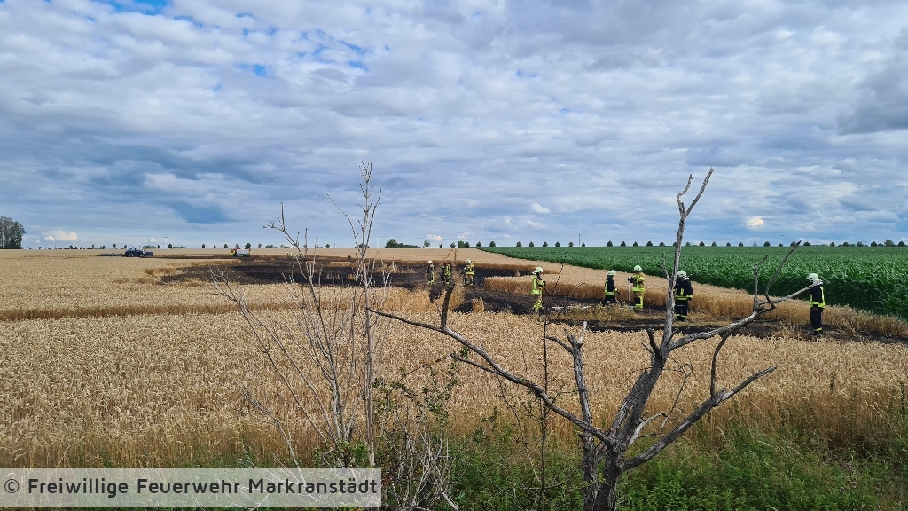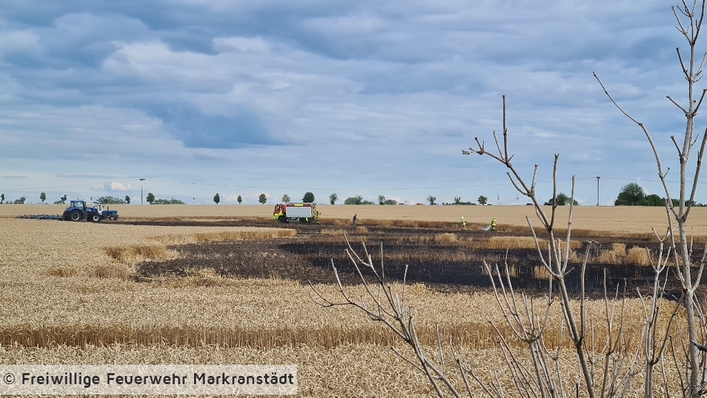Beim Eintreffen der Einsatzkräfte, stellten diese fest, dass sich die Einsatzstelle in Sachsen Anhalt befand. Dennoch unterstützten wir die Einsatzkräfte aus Lützen, die bereits vor Ort waren, bei der Brandbekämpfung des sich schnell ausbreitenden Feuers. Dank der Unterstützung eines Landwirtes, konnte ein weiteres Ausbreiten des Feldbrandes verhindert werden. Bei diesem Einsatz hat sich wieder einmal gezeigt, dass auch eine Landesgrenze eine gute Zusammenarbeit verschiedener Feuerwehren nicht verhindern kann.
