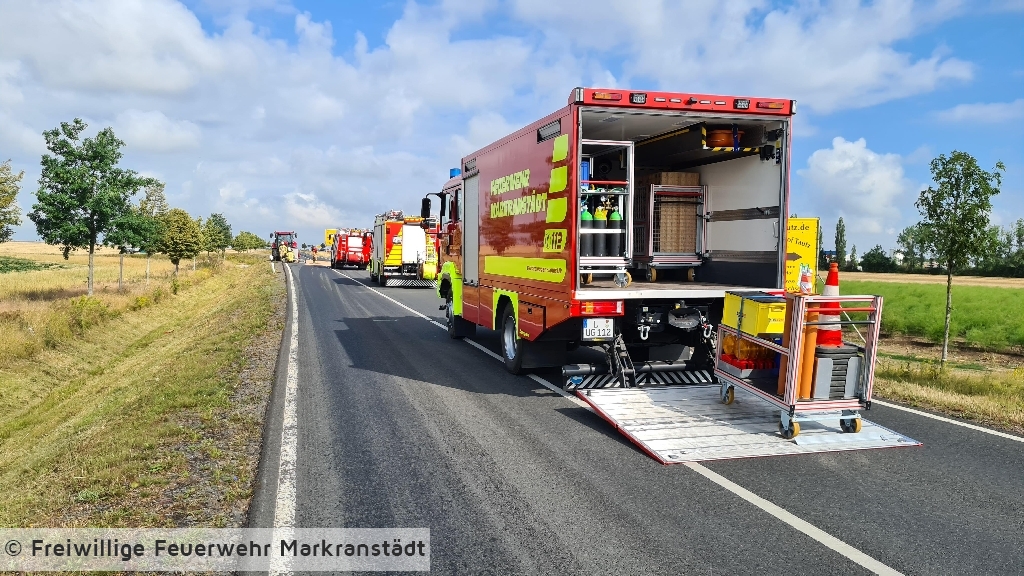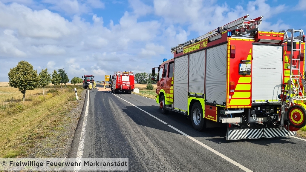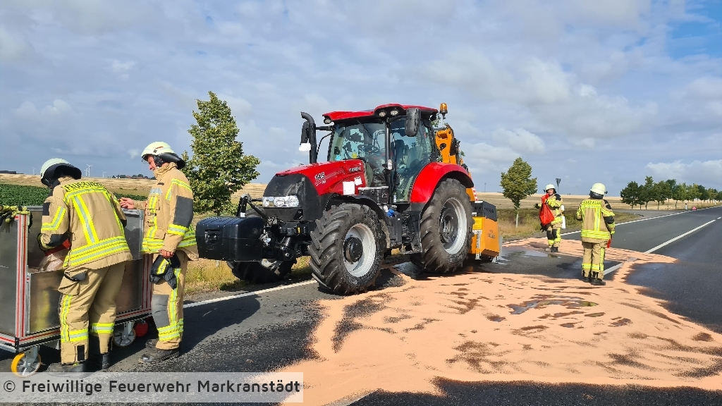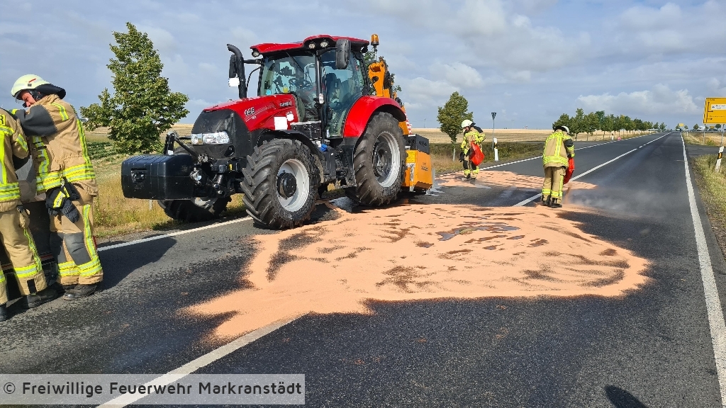 Beim Eintreffen der Einsatzkraft bestätigte sich die Alarmmeldung. Aus einem Traktor waren größere Mengen Hydrauliköl ausgelaufen. Bis zum Eintreffen der Feuerwehr fuhren jedoch andere Verkehrsteilnehmer durch das Hydrauliköl, so dass sich dieses in Form einer ca. 200m langen Ölspur auf der Straße verteilte. Die Kameradinnen und Kameraden fingen das Öl mittels Ölbindemittel auf und informierten die Firma „TopCar“ zur endgültigen Beseitigung der Ölspur.