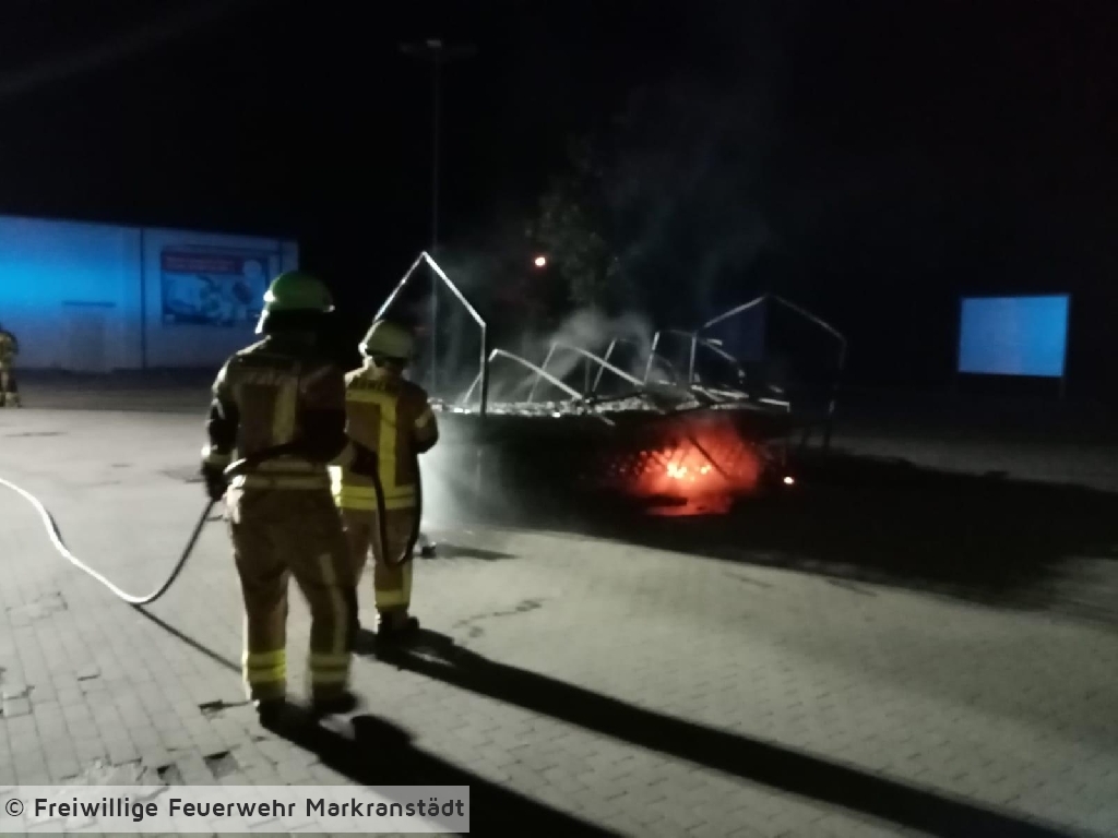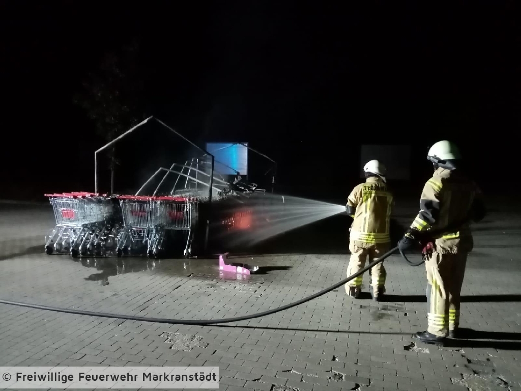 Beim Eintreffen der Einsatzkräfte bestätigte sich die Alarmmeldung. Auf einem Parkplatz eines Einkaufsmarktes in Markranstädt brannte ein Einkaufswagenunterstand inklusive mehrerer Einkaufswagen. Mittels Schnellsangriffseinrichtung des HLF konnte der Brand umgehend gelöscht werden. Im Anschluss wurde die Einsatzstelle an die Polizei übergeben.