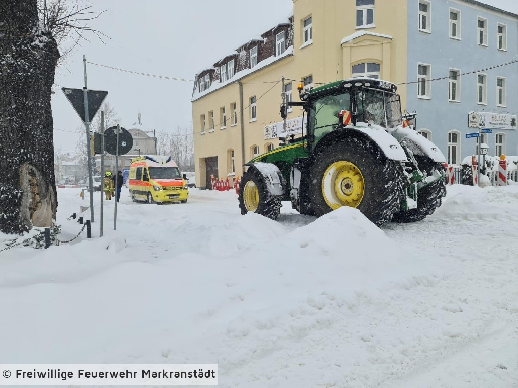Auf Grund der starken Schneefälle hatte sich ein Rettungswagen in einer Seitenstraße festgefahren. Unter Zuhilfenahme eines vorbeifahrenden Traktors, konnte der RTW zügig befreit werden.