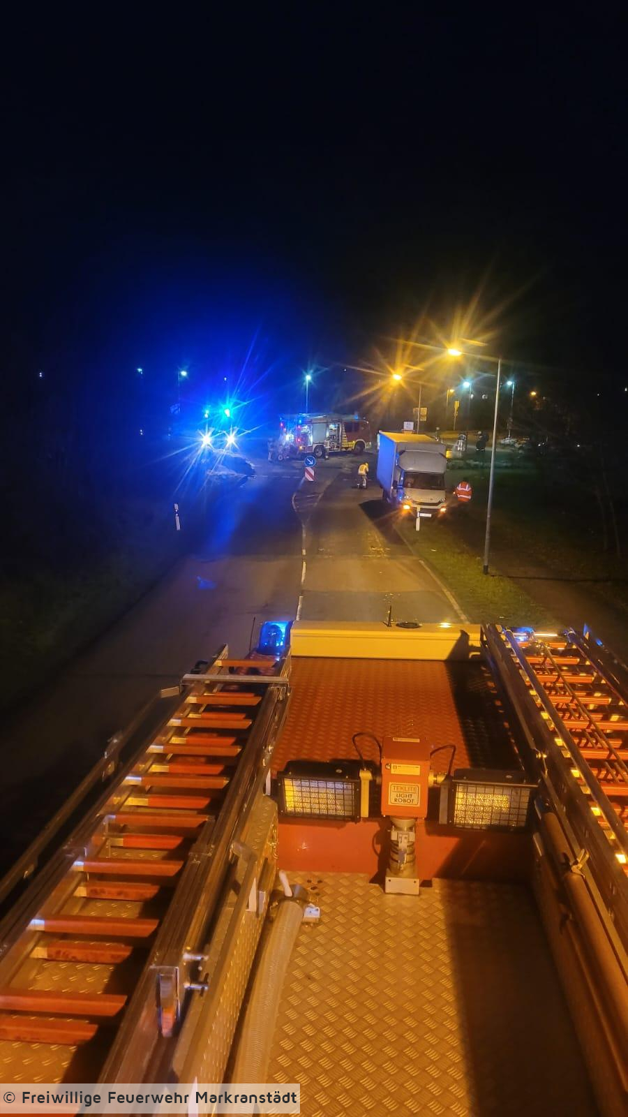 Beim Eintreffen an der Einsatzstelle bestätigte sich die Alarmmeldung. Durch einen technischen Defekt liefen größere Mengen Betriebsmittel auf die Straße. Nachdem die Einsatzstelle gesichert war, konnten die Kameradinnen und Kameraden die ausgelaufenen Betriebsmittel auffangen und die Fahrbahn abstumpfen.